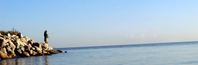 Další zastávkou je nejhnusnější místo na Fynu, aspoň podle mého názoru, vítr a vnky jako kráva...ale kluky to tady nějak láká. Tomáš se chce dát do řečí s domorodou rybářkou, dle věku a vzhledu tak Hamletovou babičkou, ta jen něcj zachrochtá, napíchne hrst hnojáků a už letí šňůra z multiplikátoru doprostřed zátoky, totéž na druhém prutě...Ivan i v tomhle hnusu dostává menšího mořáka, potom má ve vlnobití záběr Baron, nakonec zdolává docela bojovnou rybu v pohodě a palička z losí kosti končí její trápení....kolem něj při zdolávání projížděl kajakář velmi odvážným stylem a kdyby došlo ke kolizi s Karlovou šňůrou, kdoví, jak by to dopadlo......